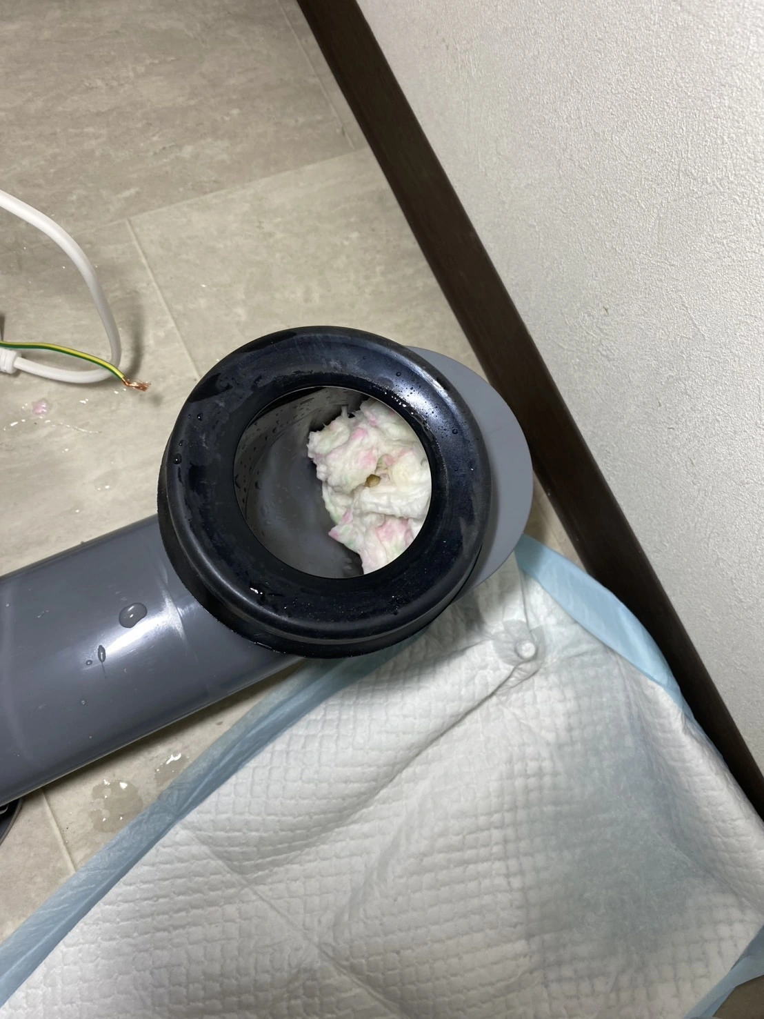 トイレの流れが悪いとのことでお伺いしたところ、排水管の奥で異物が詰まっておりました。