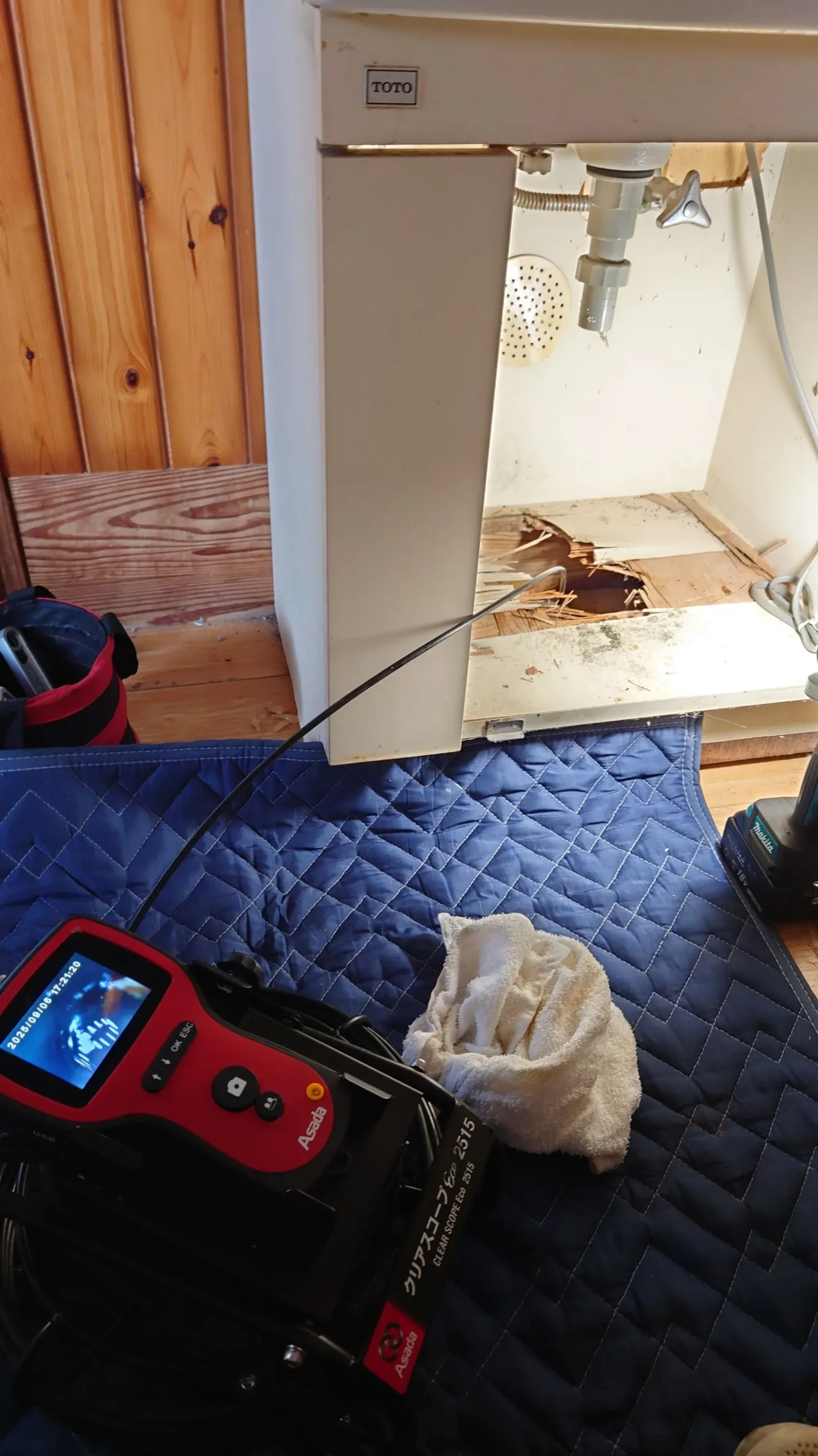 現場では、管内カメラを用いて詰まりや漏水箇所を確認し、排水トラップを脱着して応急処置を行いました。