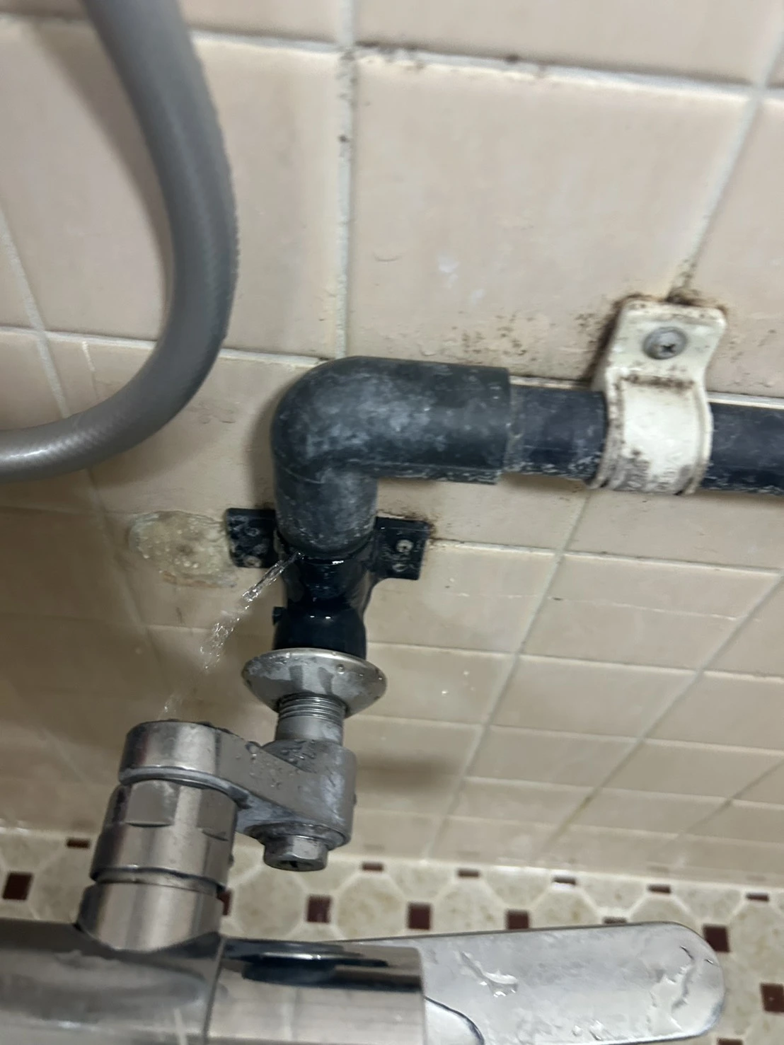お伺いした際、浴室のカランとシャワーの接続部から勢いよく水が噴き出しており、給水管内部の亀裂が原因でした。