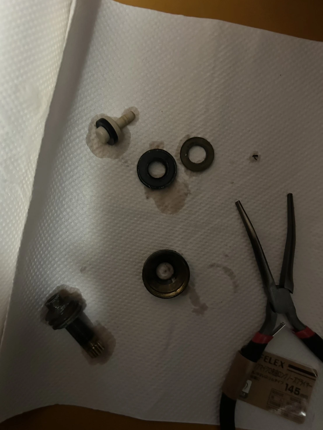 原因は内部のパッキンが経年劣化により硬化しており、止水が不完全になっていたためでした。