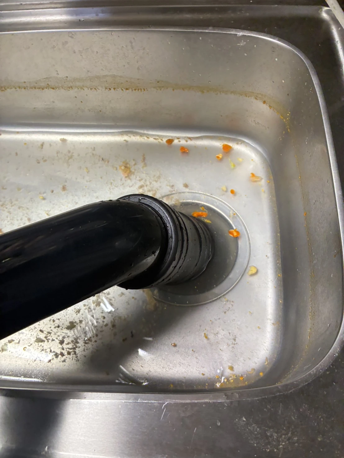 お伺いした際、シンク下の排水管内部に油汚れや食べカスが蓄積し、排水の流れがほぼ塞がれている状態を確認いたしました。