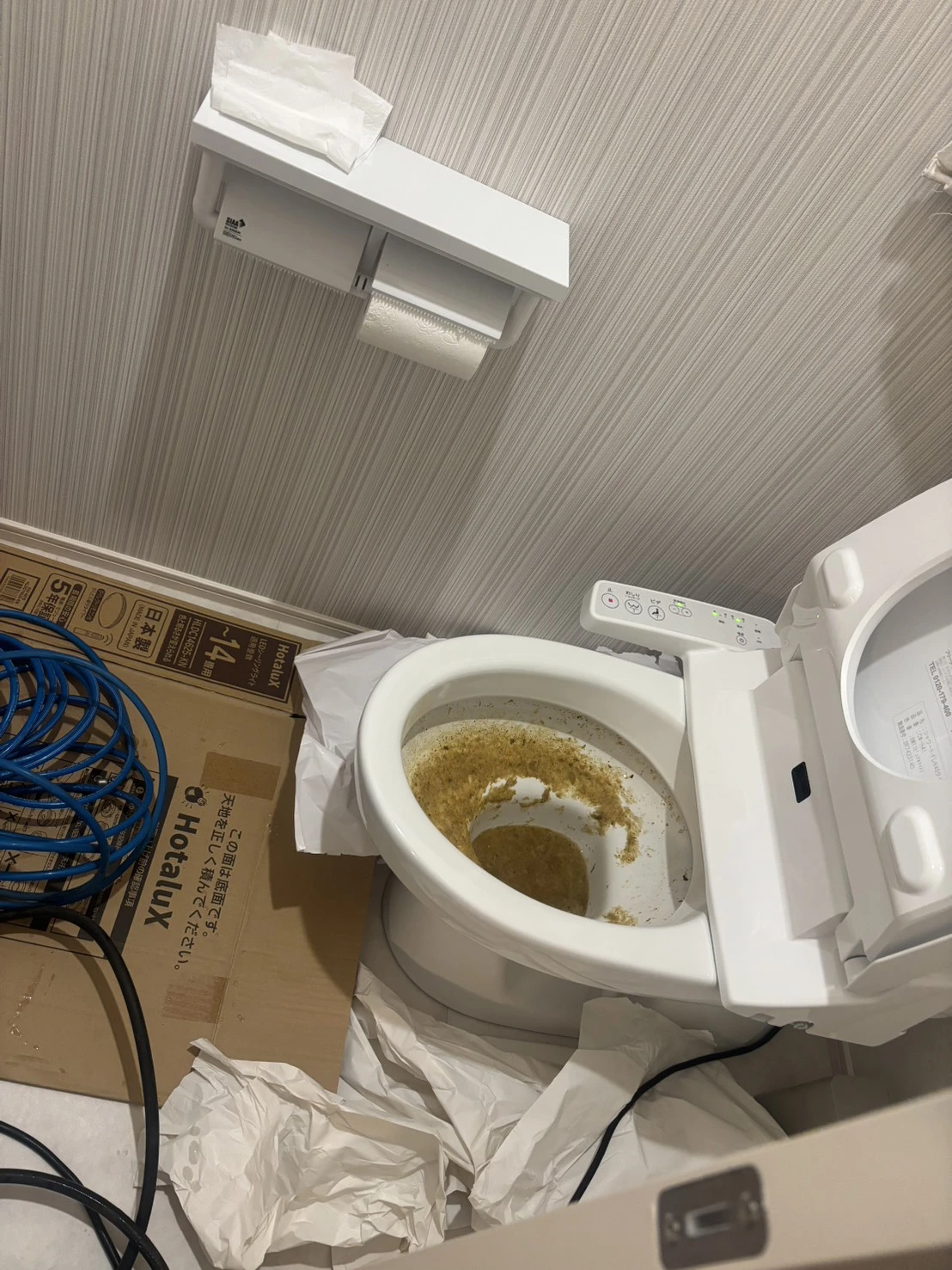 現地確認の結果、排水管内部に汚物や紙類が滞留し、完全に近い状態で閉塞しておりました。