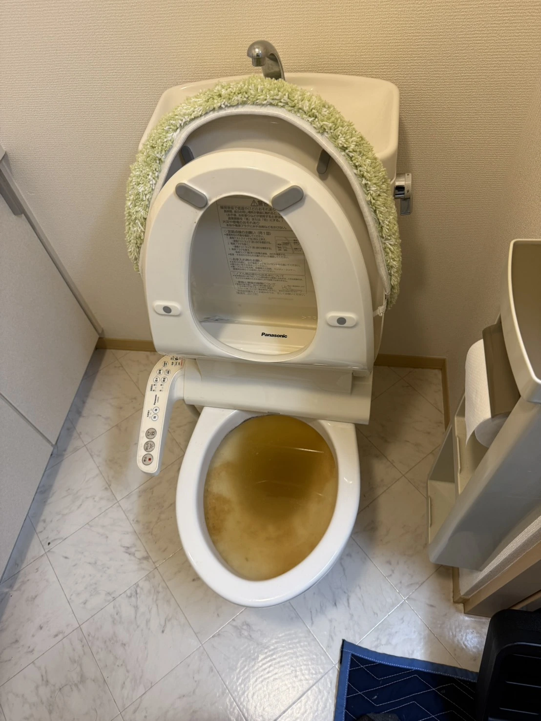 周囲を汚さないよう床や便器周りを保護しながら慎重に対応しております。