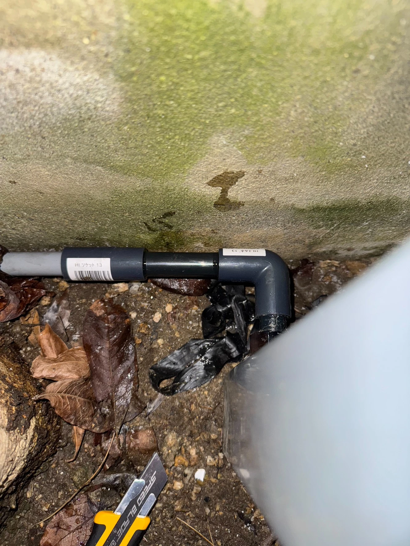 現地を確認したところ、屋外の塩ビ給水管に小さな穴が空いており、そこから水が漏れている状態でした。