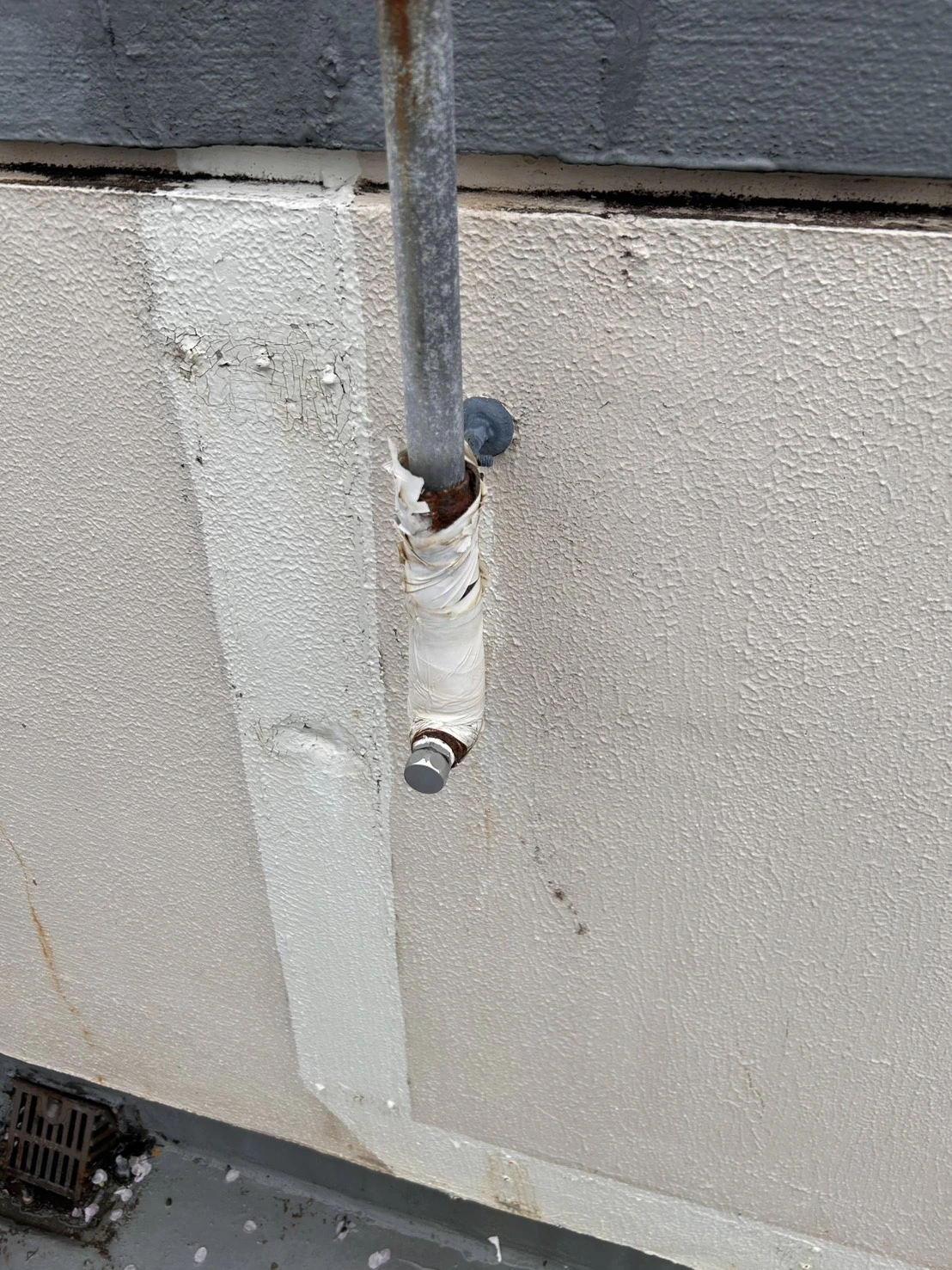 現地にて状況を確認したところ、ベランダへつながる配管部分からの漏水が見受けられたため、まずは被害拡大を防ぐための止水作業を優先して実施いたしました。