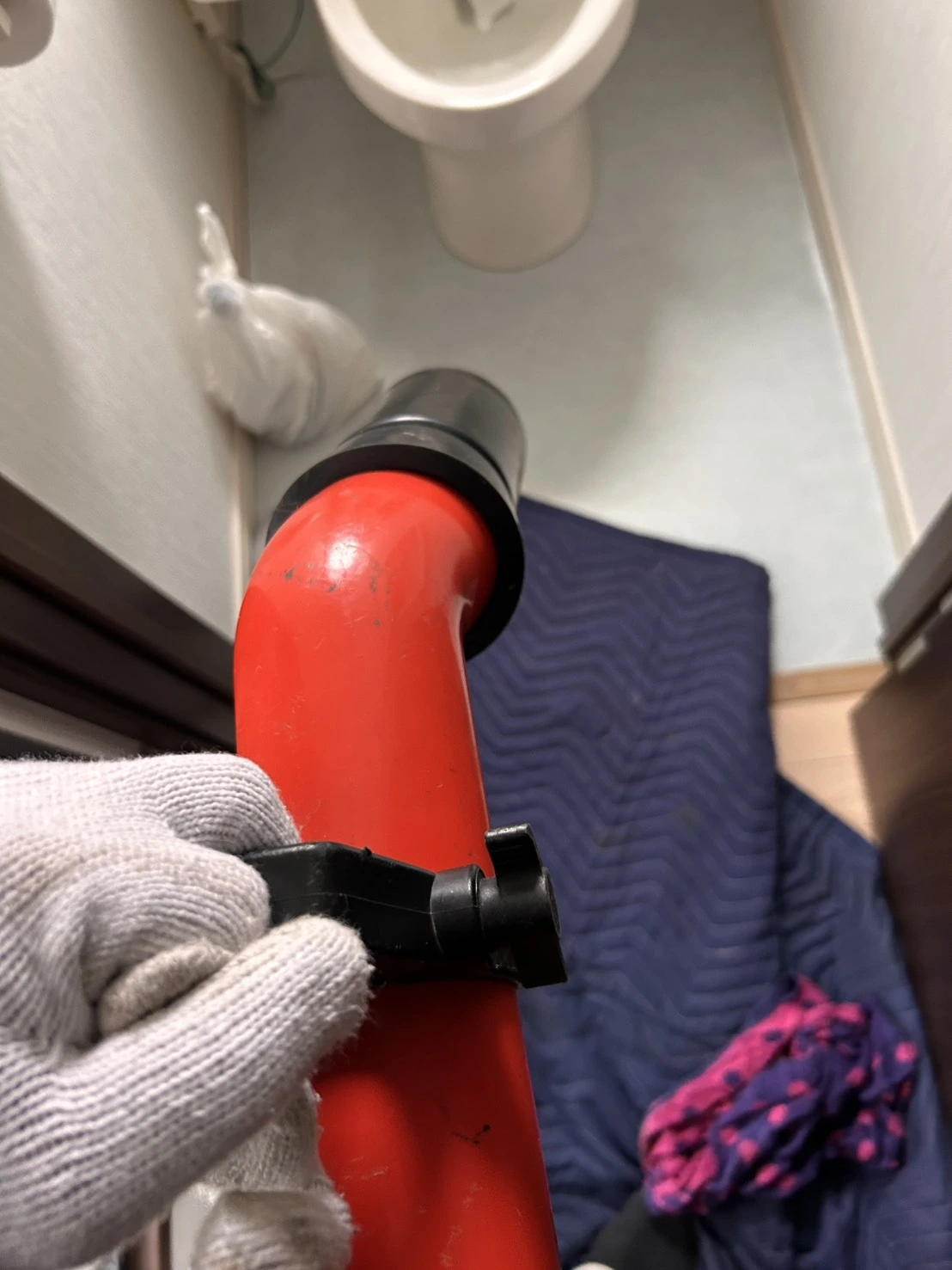 床や周辺を汚さないよう養生しながら進め、無理な力をかけず配管への負担も抑えています。