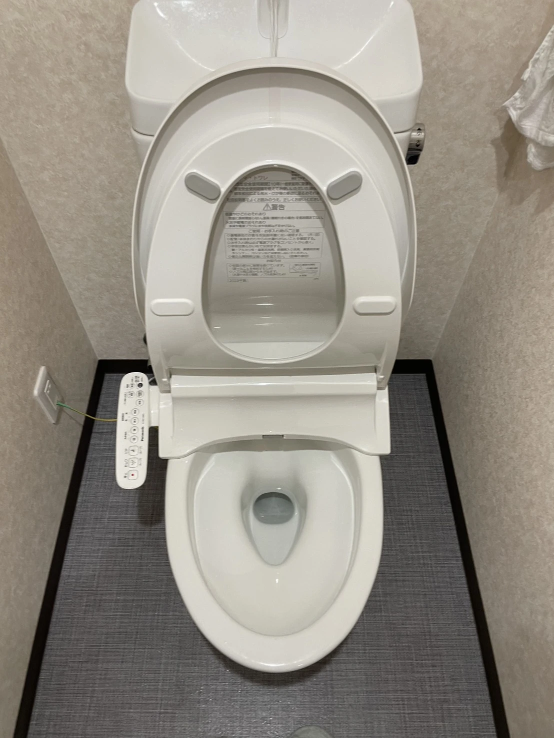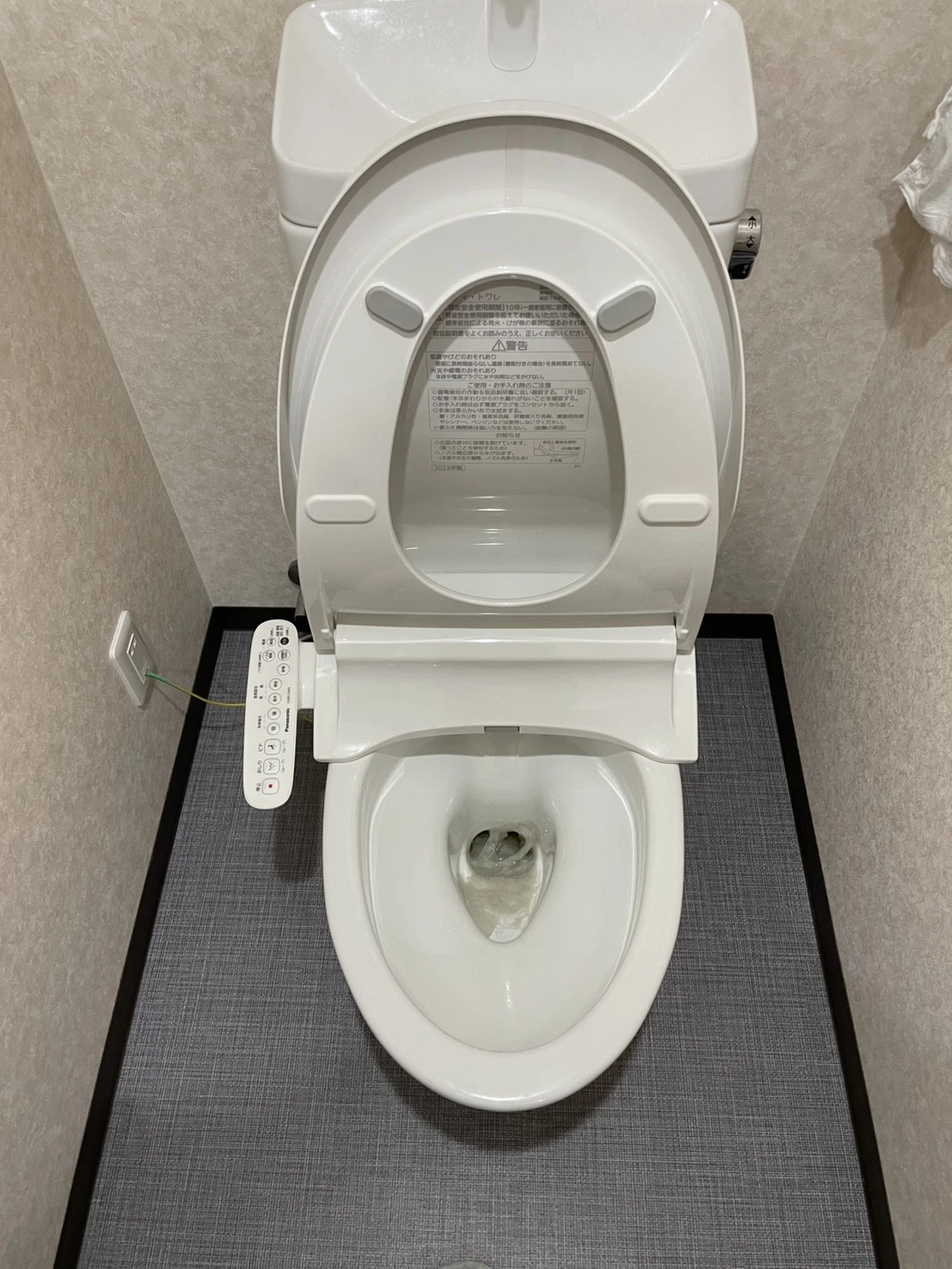 作業中は床や周囲への水はねを防ぐため養生を行い、便器まわりも都度拭き取りながら進めました。