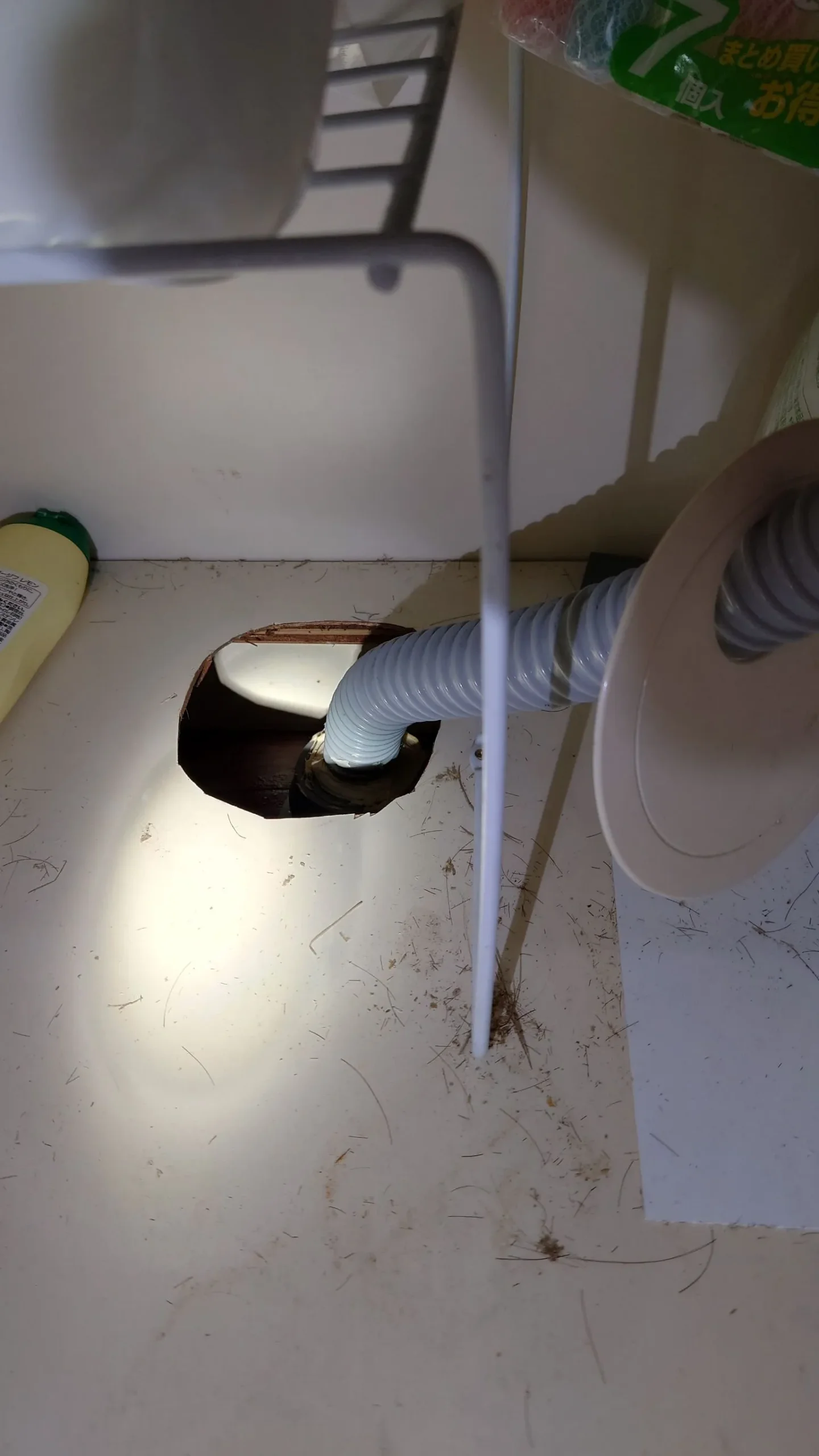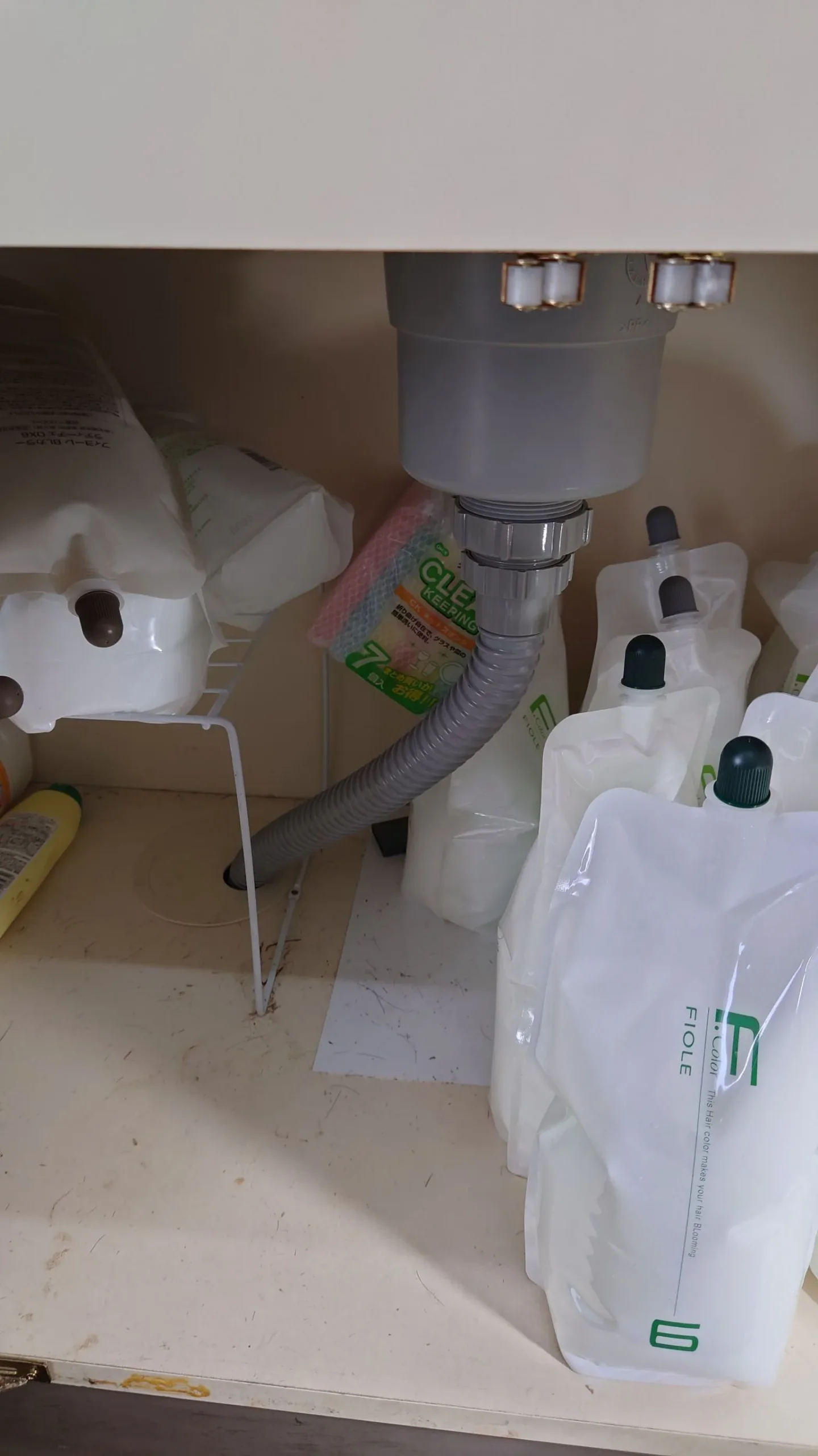 シンク下の水漏れは、排水蛇腹ホースの劣化と内部の詰まりが重なって発生していました。