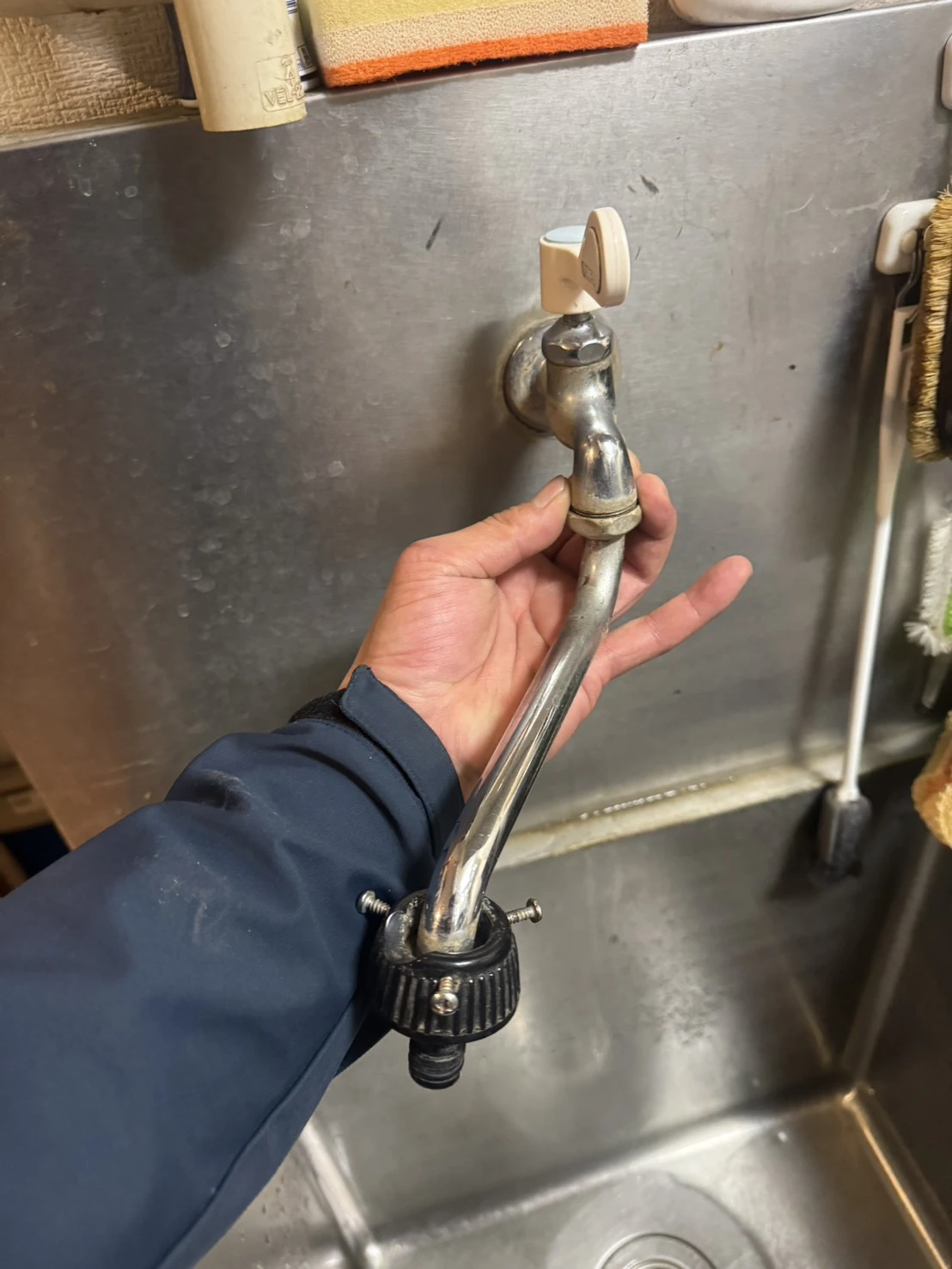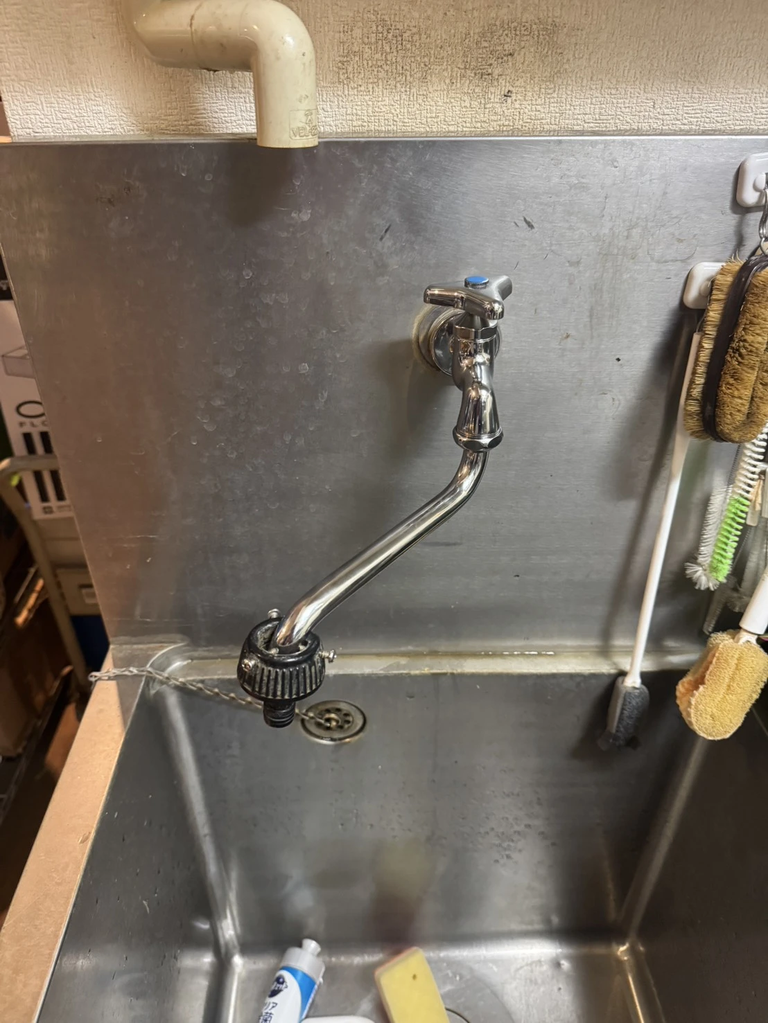既存の単水栓を取り外し、接続部の状態を確認しました。