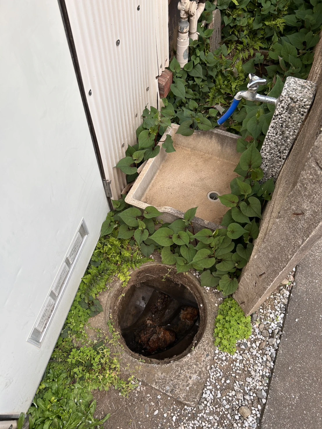 現地を確認したところ、屋外の排水桝に汚れや固形物が蓄積し、排水の流れを妨げている状態でした。