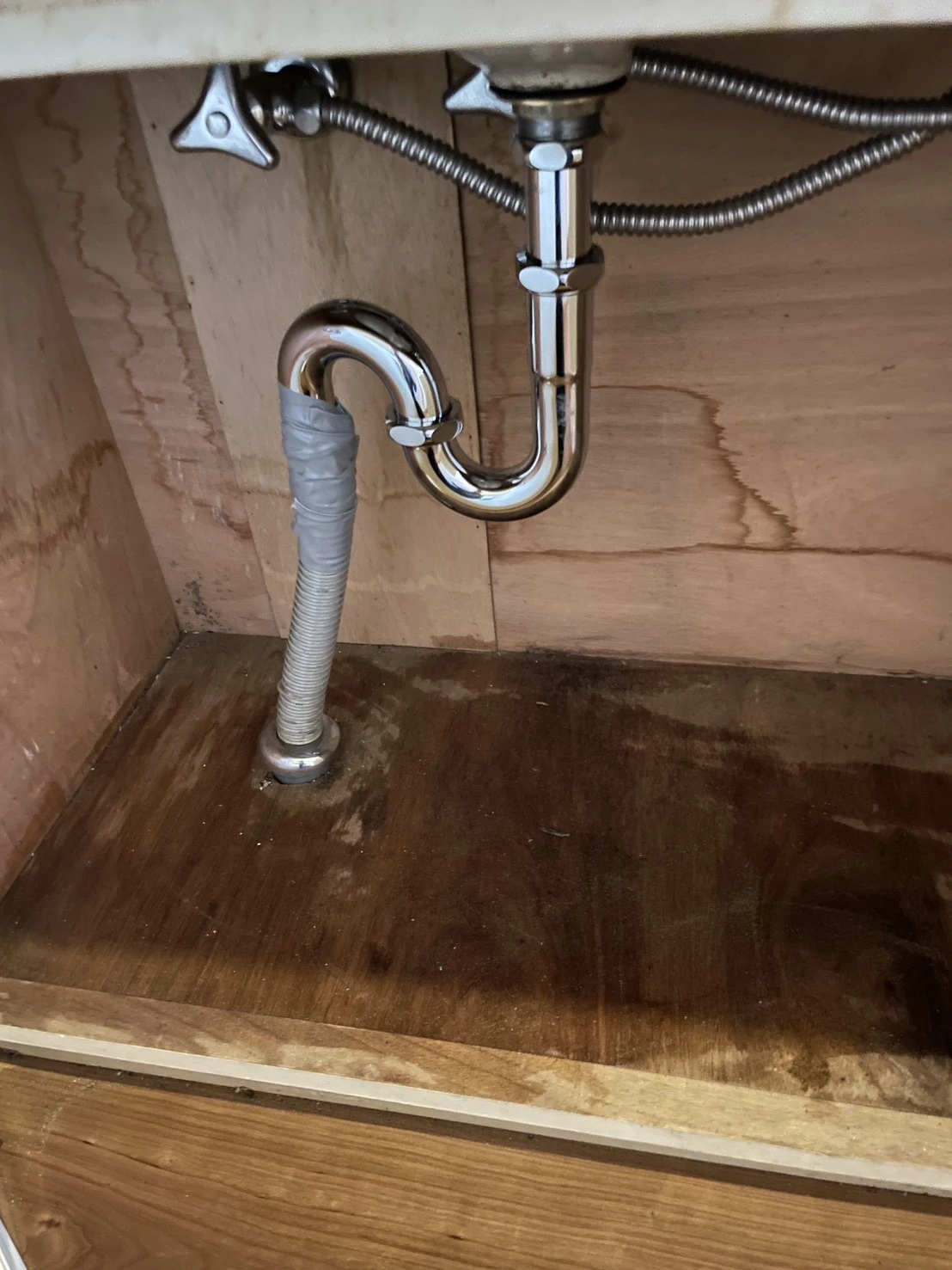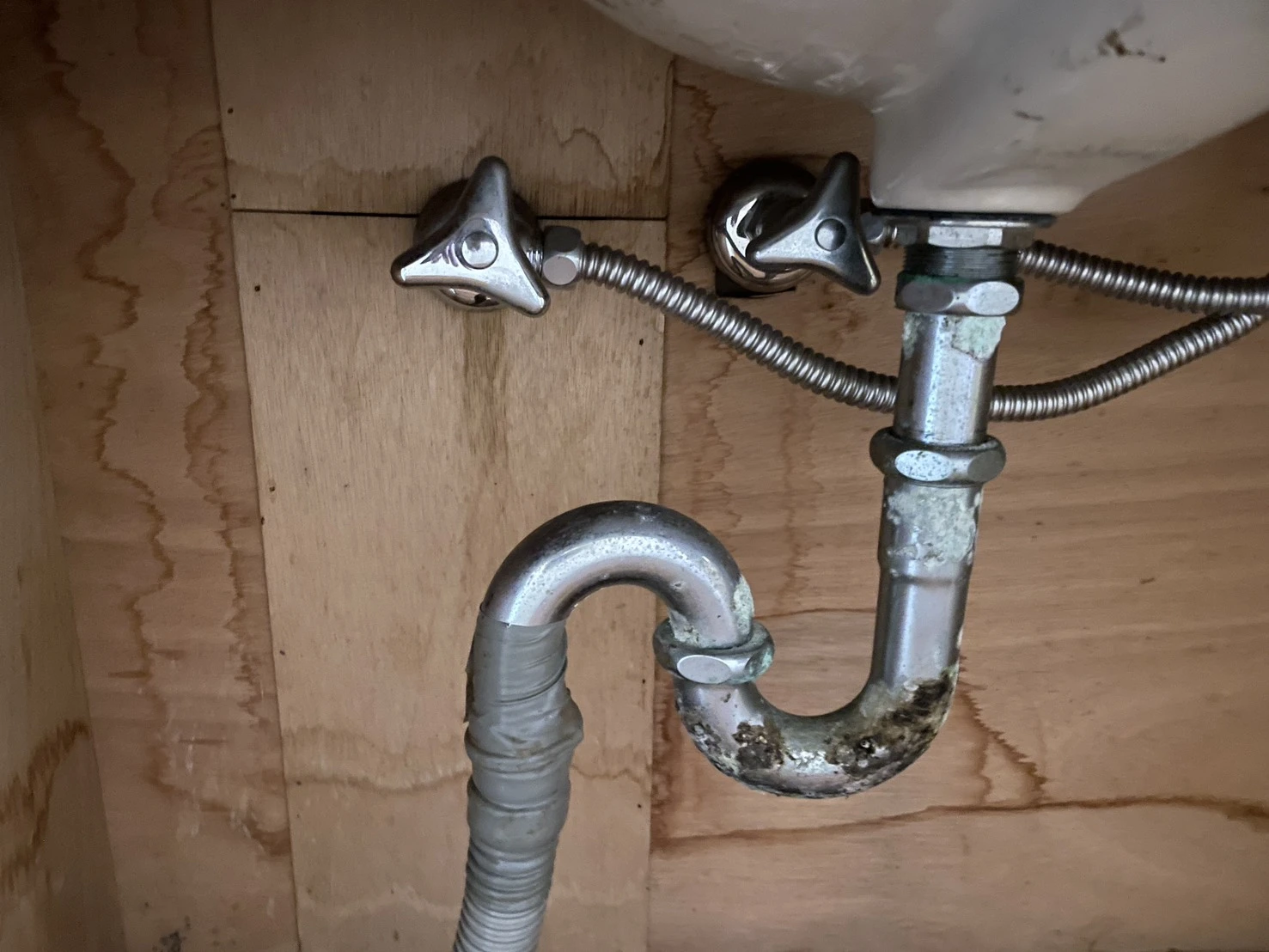 今回の洗面所配管トラブルは、金属製トラップ部分の経年劣化により穴が開いてしまったことが原因でした。